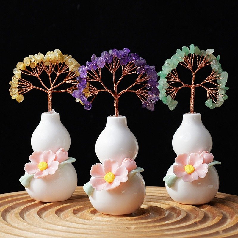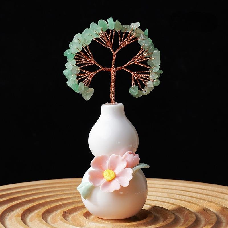 Handcrafted Gourd Crystal Tree, a symbol of prosperity, good luck, and flourishing success. Made with natural crystals, copper wire, and ceramic gourd base, this Feng Shui piece brings positive energy to your space.