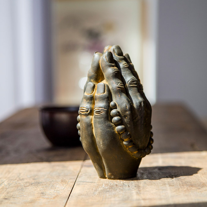 A handcrafted Buddha Hands Feng Shui figurine symbolizing blessings, harmony, and spiritual serenity, perfect for creating a tranquil and auspicious atmosphere.