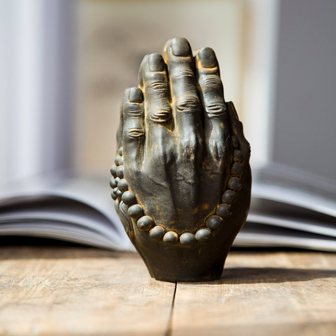 Each figurine is handcrafted with attention to detail, emphasizing the smooth contours and harmonious balance of the hands in prayer. The use of iron powder adds a grounded, earthy quality to the piece, while its serene design resonates with the tranquil energy of meditation and mindfulness.