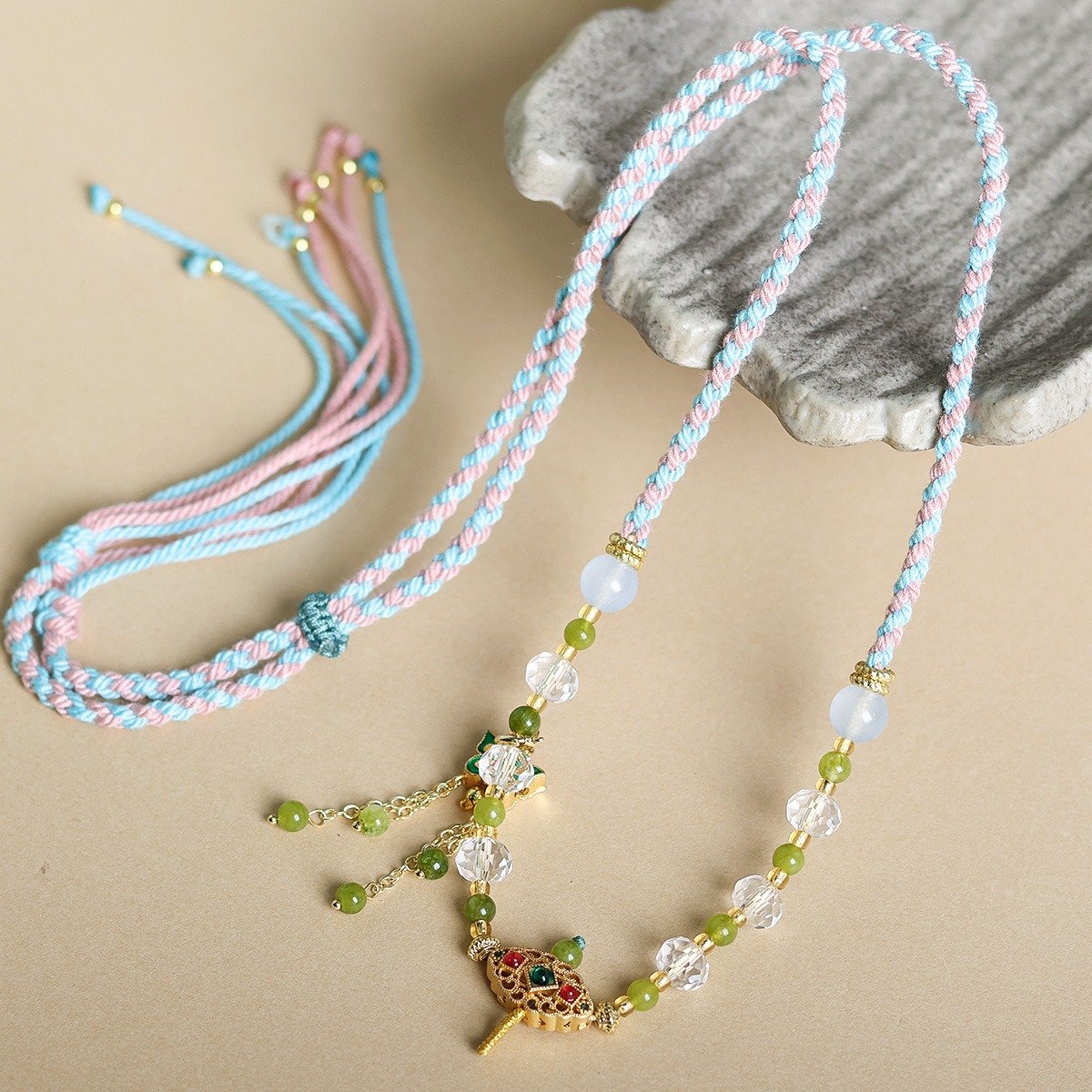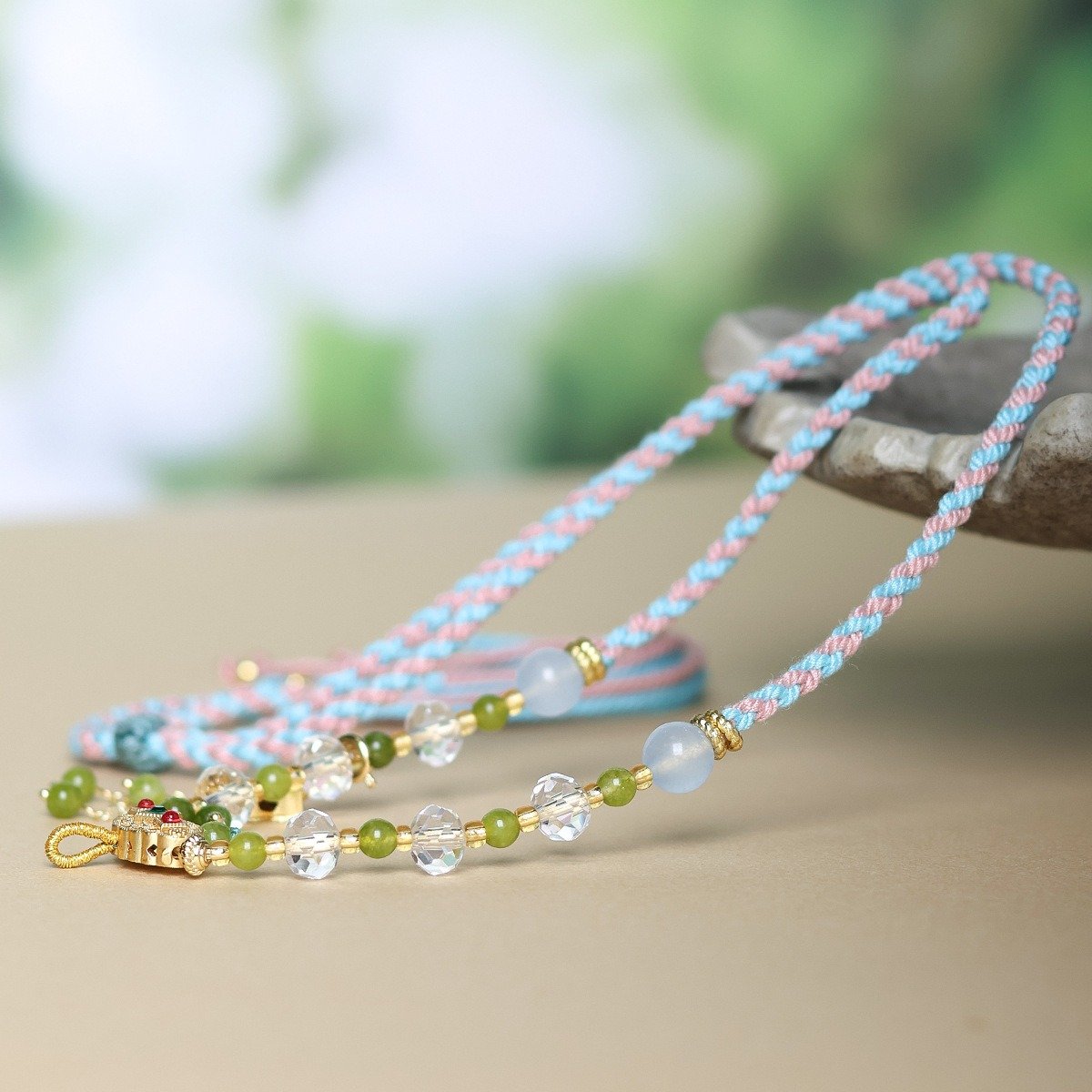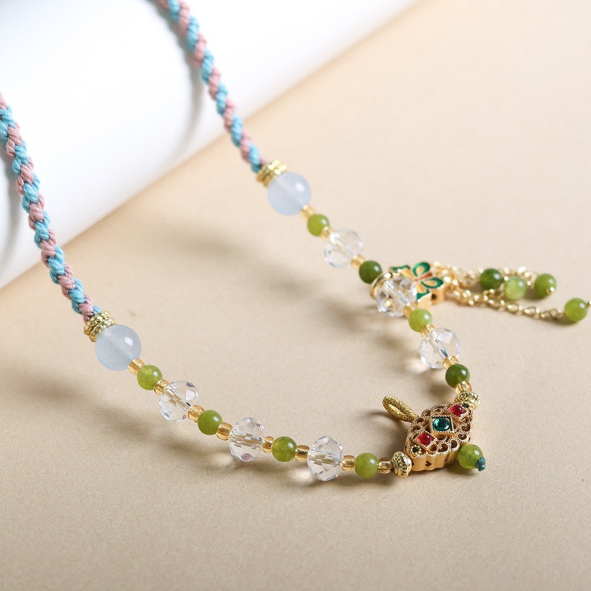 A handcrafted cotton necklace featuring enamel butterfly, aquamarine, jade, and white crystal. This necklace symbolizes transformation, freedom, and the energy of new beginnings in Feng Shui.