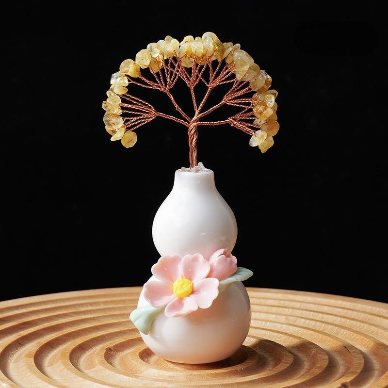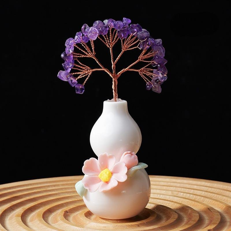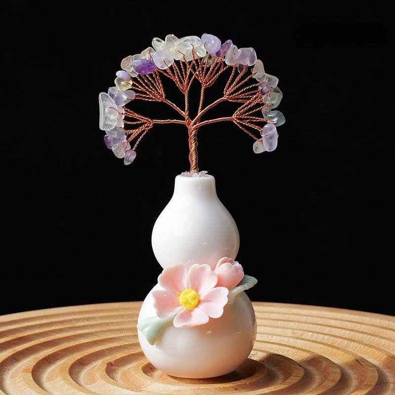 Handcrafted Gourd Crystal Tree, a symbol of prosperity, good luck, and flourishing success. Made with natural crystals, copper wire, and ceramic gourd base, this Feng Shui piece brings positive energy to your space.