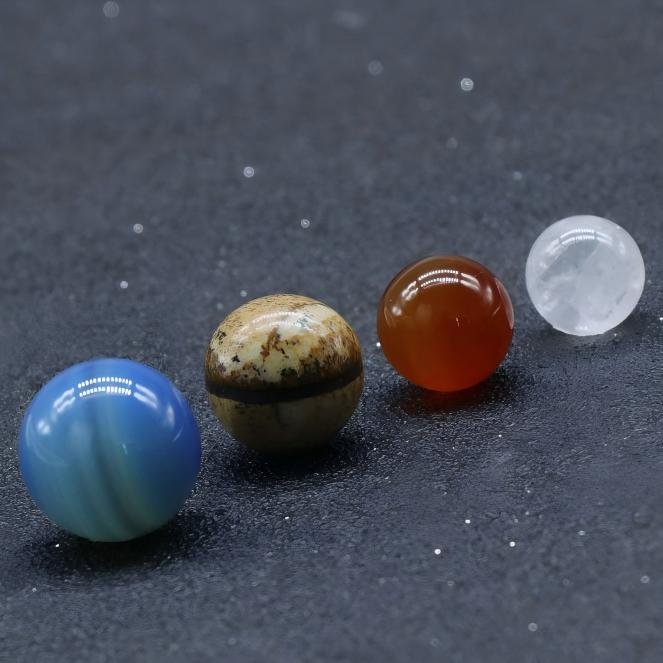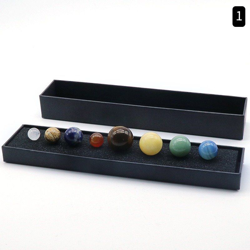 A stunning Natural Crystal 8 Planets Universe Set, where each crystal represents a planet, harmonizing your energy with the universe. This cosmic gift set features unique crystals including Clear Quartz, Picture Stone, Sodalite, Red Agate, Tiger Eye, Yellow Jade, Aventurine, and Blue Agate, each corresponding to a different planet.